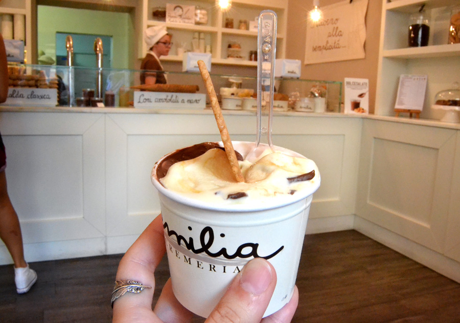 Thay vì bày ra những khay gelato lớn để du khách lựa chọn như các tiệm Gelateria khác, những khay gelato tại Emilia Cremeria được bọc kín trong những hộp bạc, bạn sẽ không thể biết được hình dạng, màu sắc của chúng như thế nào cho đến khi mua. Tuy nhiên, sự “chờ đợi” này sẽ được đền đáp xứng đáng khi bạn cầm trong tay chiếc kem gelato với lớp ốc quế bên trong được phủ một lớp socola thơm nóng chảy được lấp đầy bởi những viên gelato ngon lành đầy màu sắc.